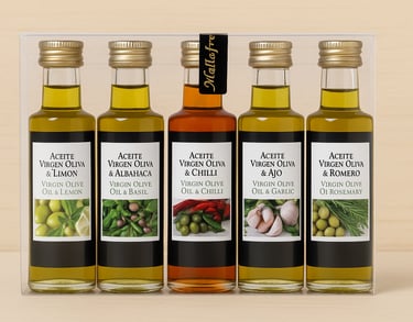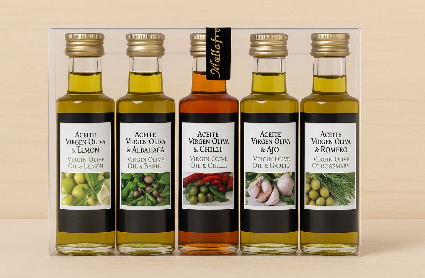 Um kit exclusivo com 5 azeites virgem extra aromatizados, apresentados em elegantes botellines de 4 cl, dentro de um estojo transparente.